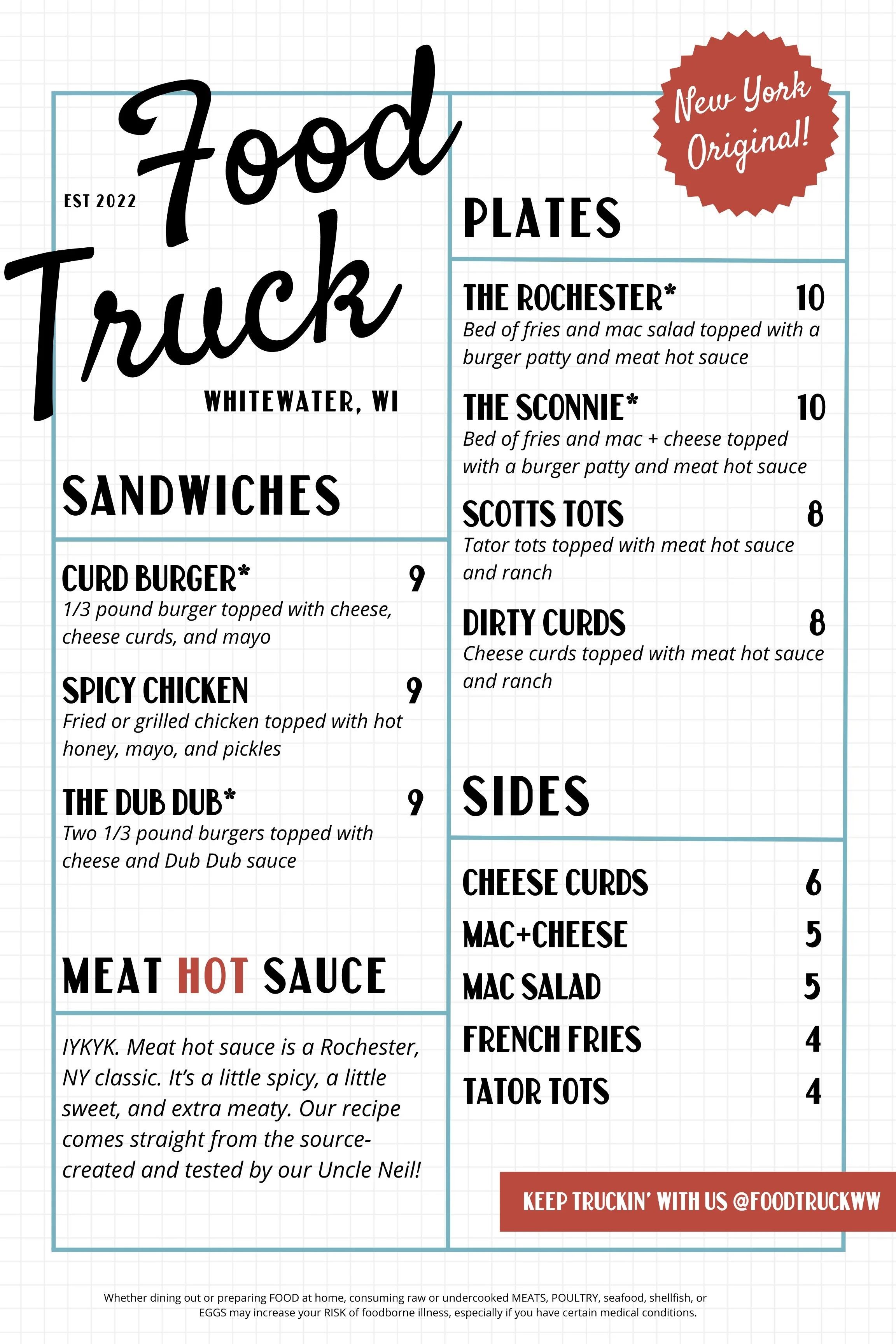 We’re the Food Truck! We are a family run food truck with origins in Rochester, NY. The Food Truck recently made the 700 mile trip to Whitewater, WI and we brought our favorite recipes with it. Ever heard of the Garbage Plate? Or Meat Hot Sauce?